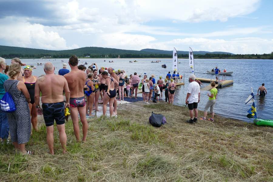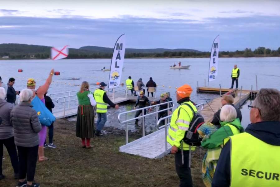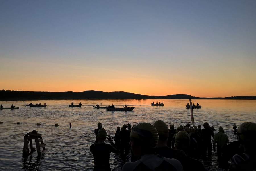 The mass start at 2000 meters is done during the daytime. It starts at the beach north of the Arctic Circle and before reaching the finish line south of the Arctic Circle you will have swum over the national border to Finland. Start and finish at the Swedish shore.